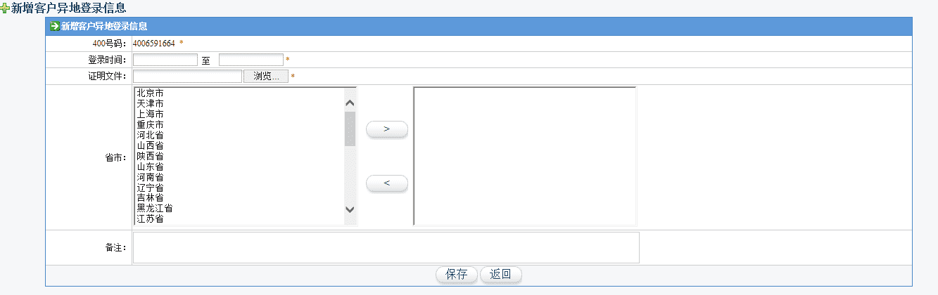 - 新增:新增异地登录信息,选择登录时间,省市等信息,点击【保存】即可;