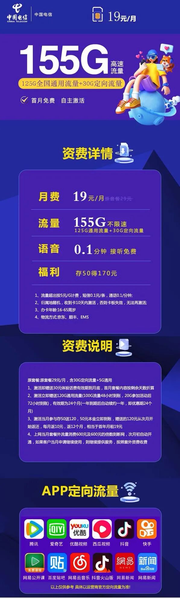 电信湘潭卡19元包125G通用+30G定向+通话0.1元/分钟