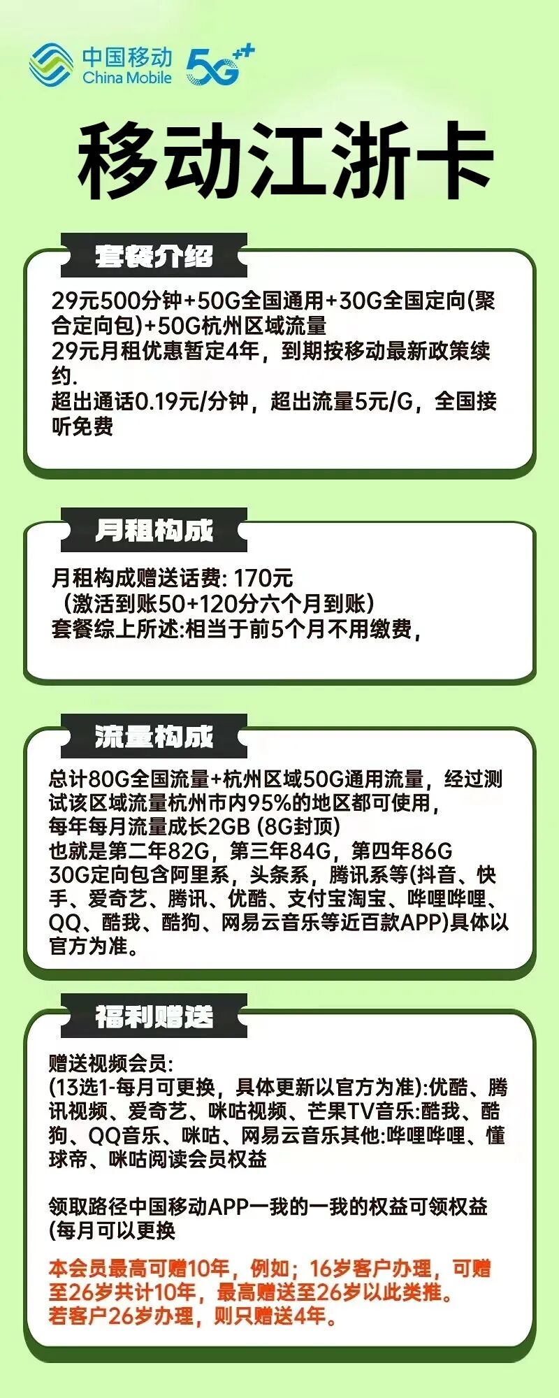 29包50G全国+50G杭州部分区域通用+30定向+1500语音(500全国通话+1000虚拟网络语音)送2T移动云盘 29元月租优惠暂定4年,到期按移动最新政策续约