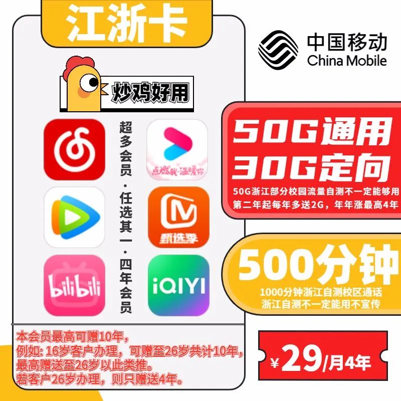 江浙卡29包50通用+30定向+50校区流量+500分钟通话+4年会员