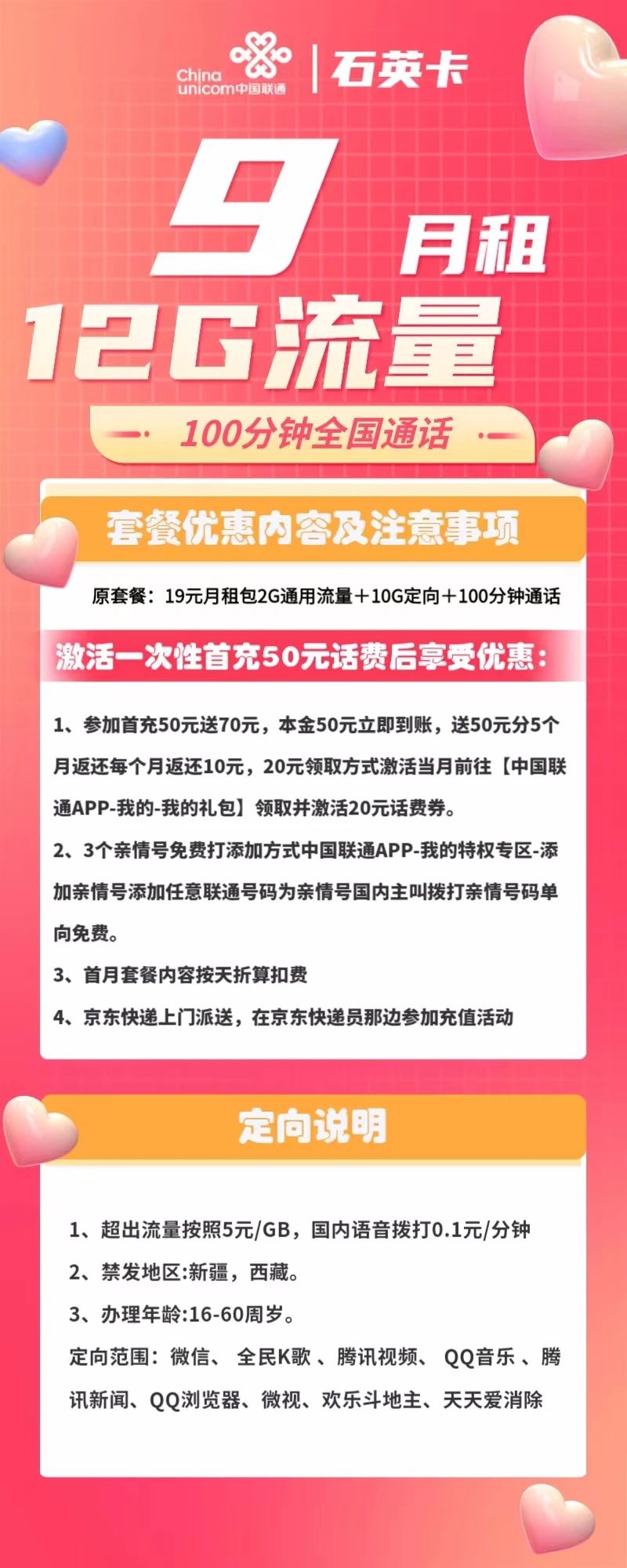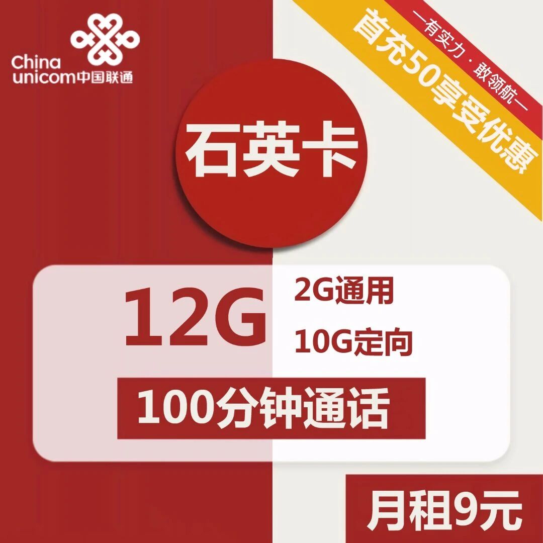 联通石英卡9元包2G通用+10G定向+100分钟通话