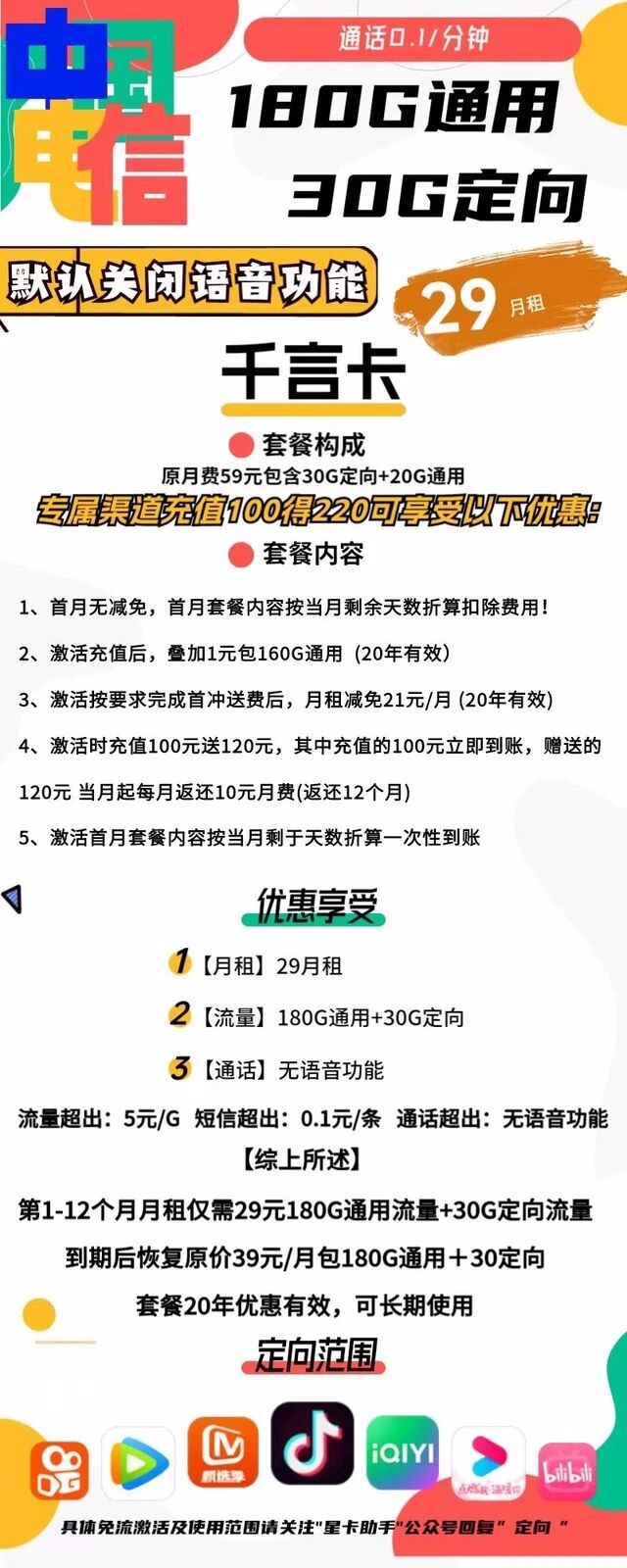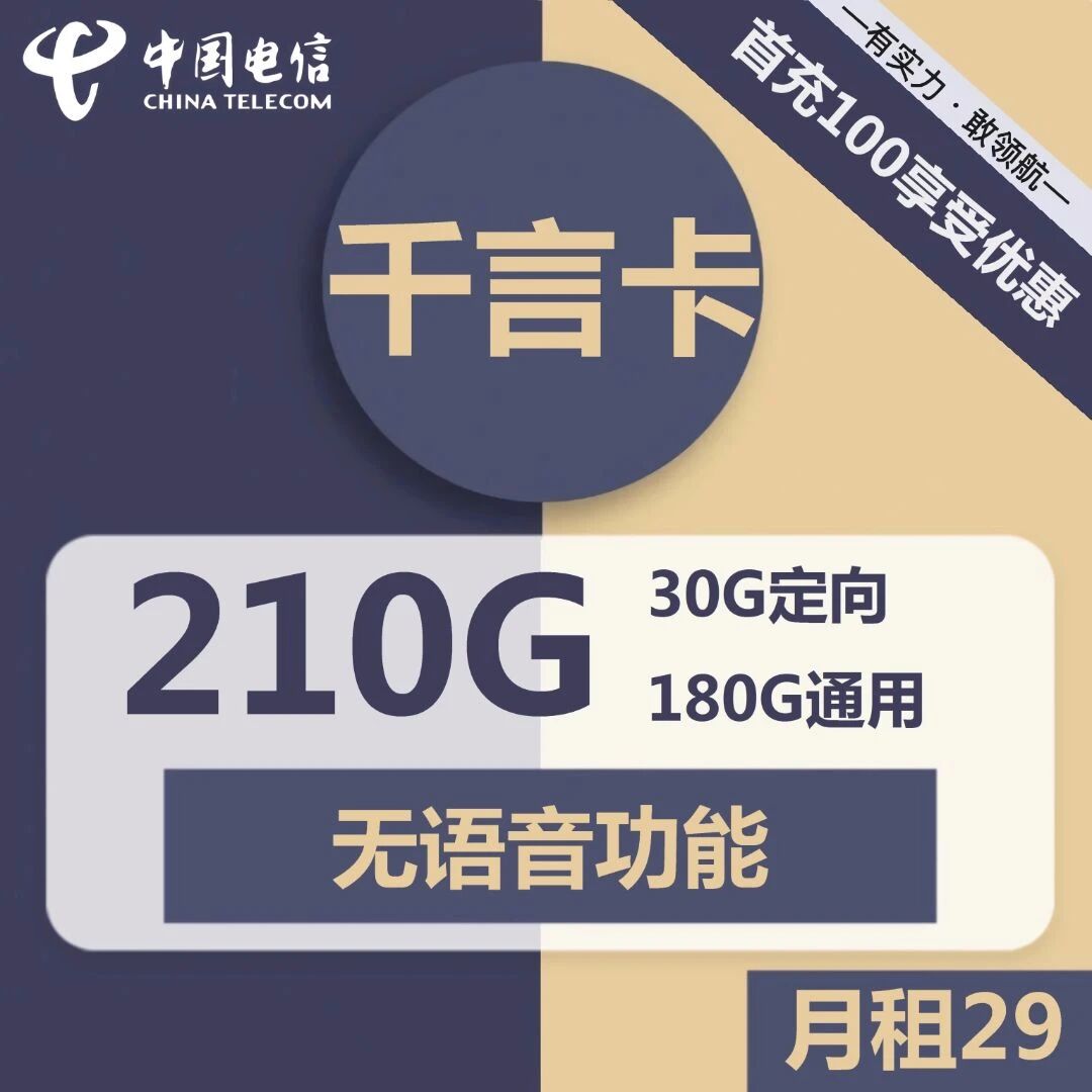 电信千言卡29元包180G通用+30G定向+无语音功能